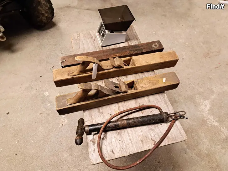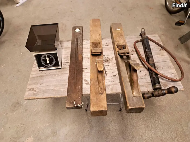 Säljes gamla verktyg, 2st hyvlar, vattenpass, bilpump & hushållsvåg.