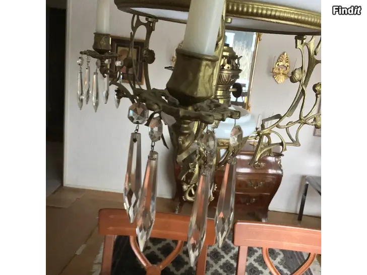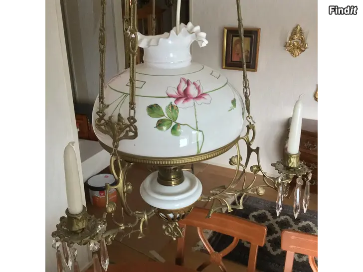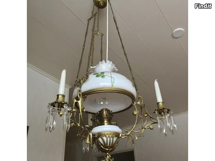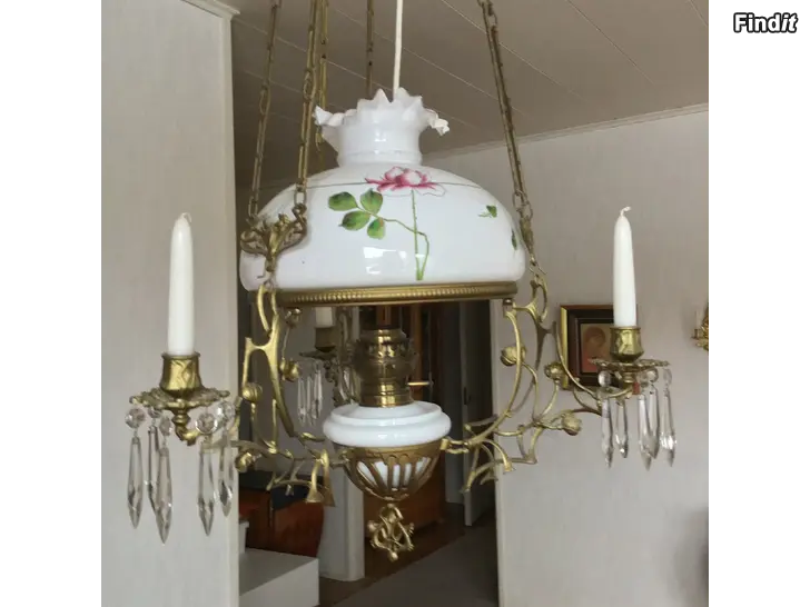 Oerhört vacker takkrona, f.d olje-,nu med el, med tre ljus och sällsynt vacker porslinskupa. 1800-tal. Seriösa bud även välkomna.