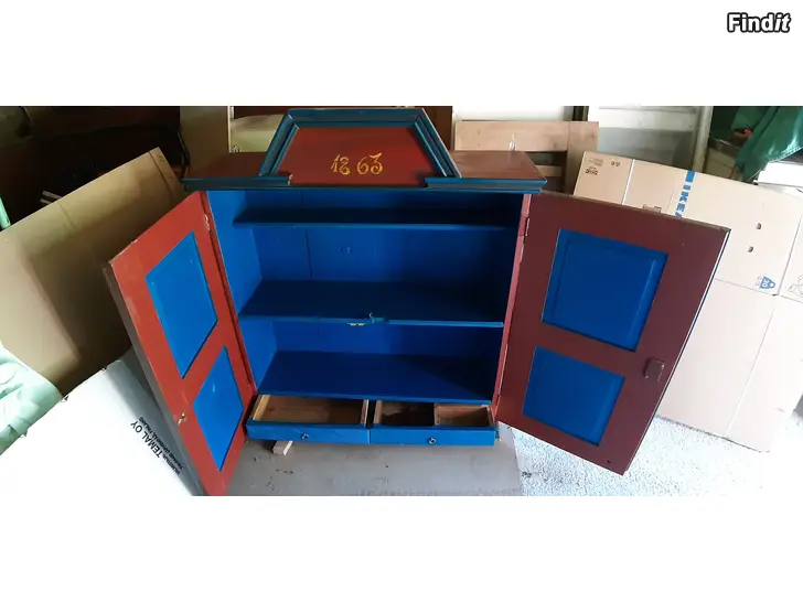 Restaurerat allmogeskåp från 1863 vars mått är 90 x 91,5 cm x107 med spegeln medräcknad säljes.