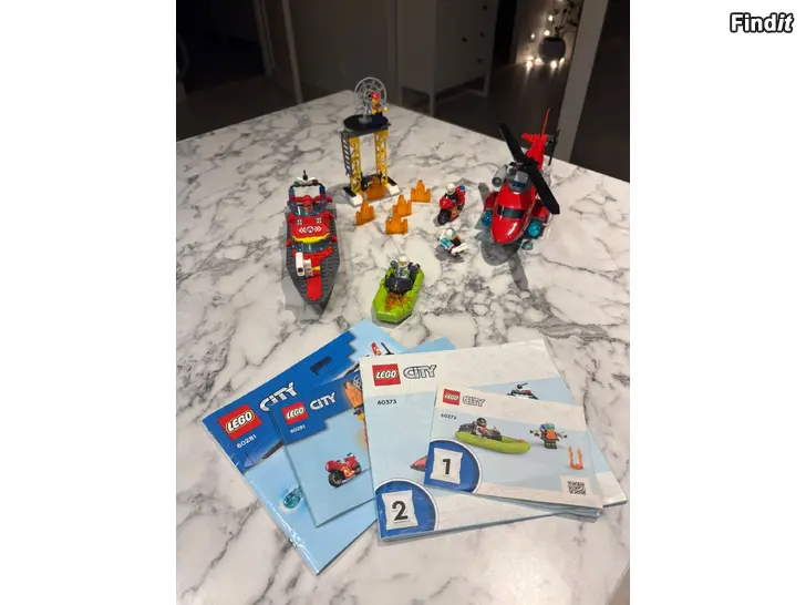 Polisbil 60312. Alla bitar finns. 5€ Flygplan 60250. Allt finns förutom postlådan. 5€. Helikopter/brandfordon 60281 och sjöräddning 60373. Alla bitar finns. 20€ för båda setten.
