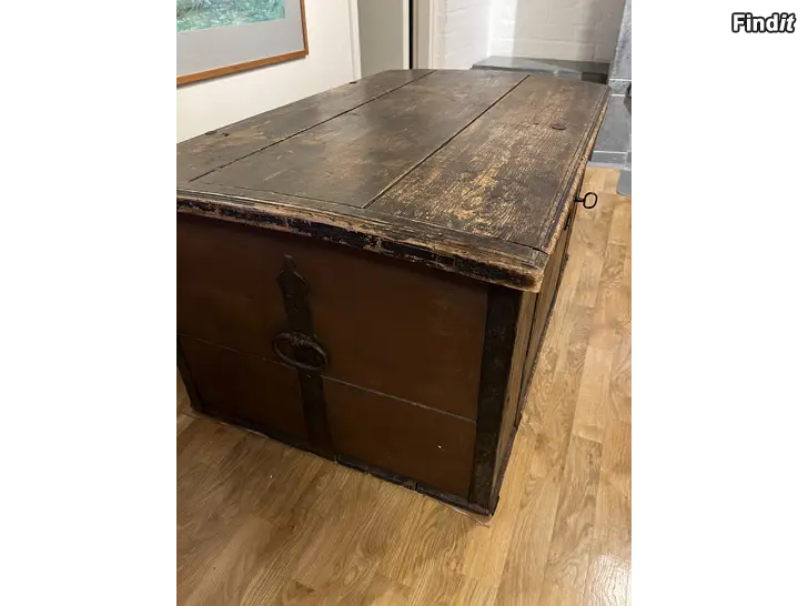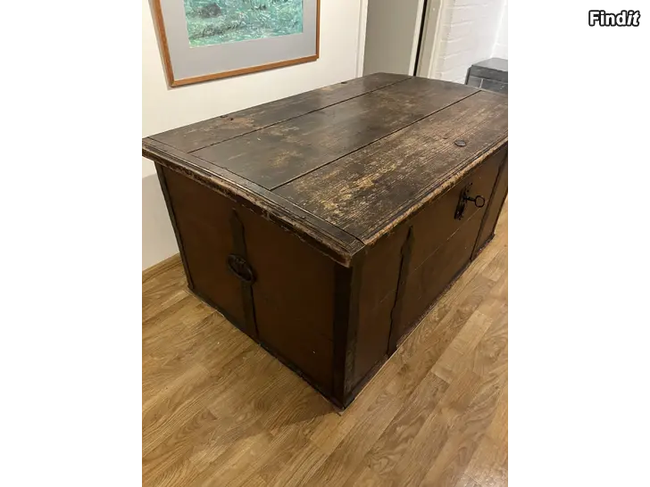Mycket fin träkista säljes till högsta bud. Kistan har måtten 118 cm x 75 cm med höjden 59 cm. Locket är lite böjt, men kistan kan bra användas som bord. De senaste åren har kistan använts som vedförvaring inomhus. Nyckel finns och låset fungerar. Fina beslag. Säljs på flera ställen. Bud från 200 €. Budgivning slutar fredag 5.12 kl 20.00.