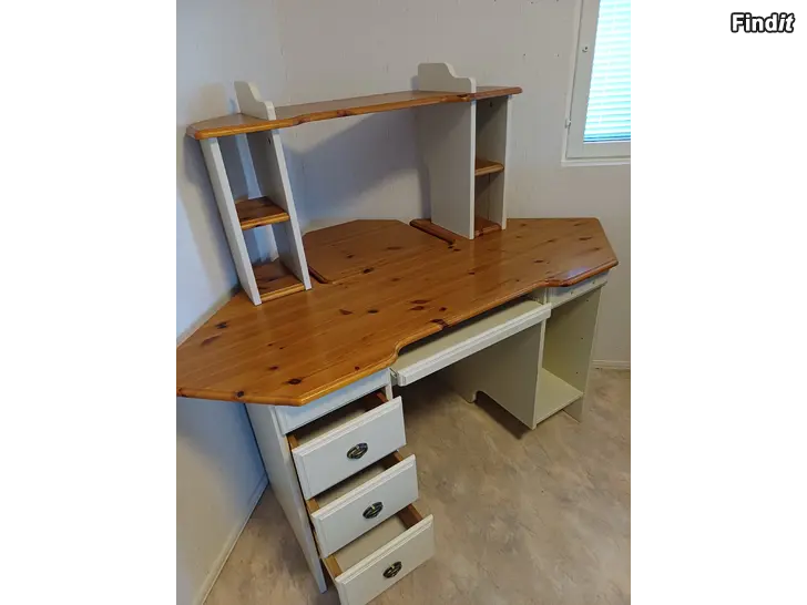 Hörnskrivbord i fint skick i vaniljvitt/furu, passar ochså fint som sy och pyssel bord, finns i Helsingby