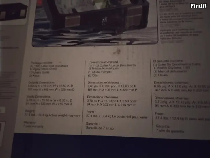 Varastolöytö, paloturvalipas Honeywell 1103. Vedenpitävä, kelluva paloturvalipas suojaa palo- ja vesivahingoilta. ½ tunnin palonsuojaus +843 °C asti. Paino 12,5 kg. Ilmeisesti ei ole ollut käytössä, pahvilaatikon teipit näyttävät koskemattomilta eli kaiken pitäisi olla tallessa. Lipas hankittu mahdollisesti 2018-2020 välisenä aikana. Tarjouksiakin harkitaan