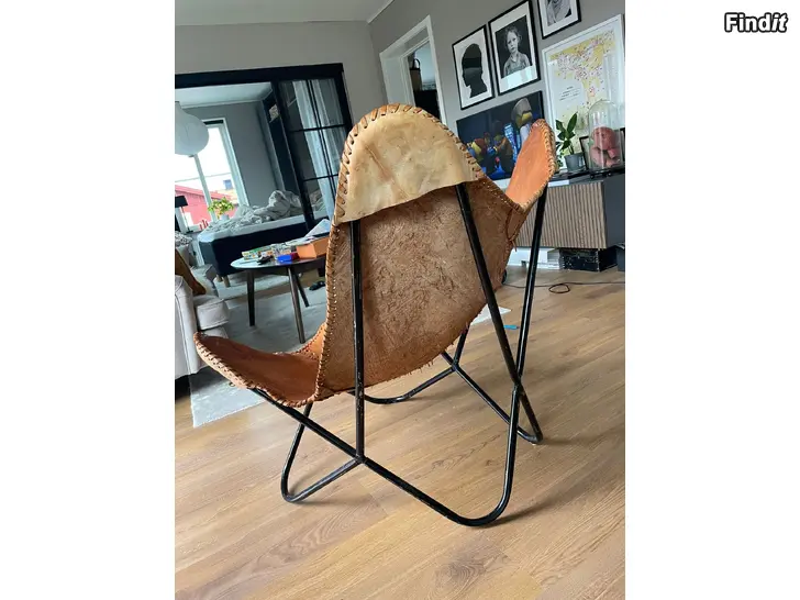 Fladdermusfotölj i buffelskinn med svart metallstomme. För inomhusbruk. Sparsamt använd, fint skick!