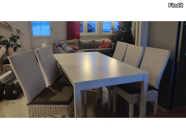 Bord och 6 stolar säljes. Stolarna i bra skick. Bordsskivan har skråmor och märken. Allting är stabilt och användbart. Sittöverdragen är tvättbara.