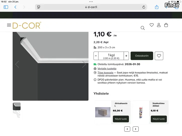 Materialet är frigolit grundmålade 16st a’ 2,00m. Taklisterna är lätta att få på plats, limmas fast, lätta att gira med tex järnsåg.