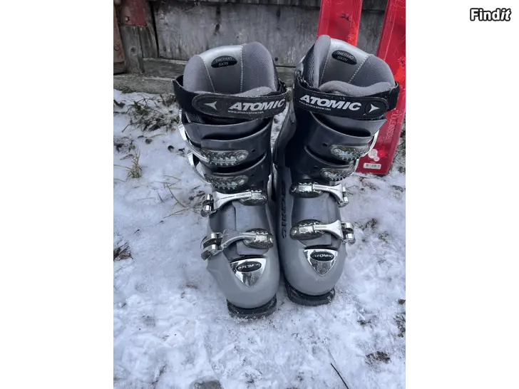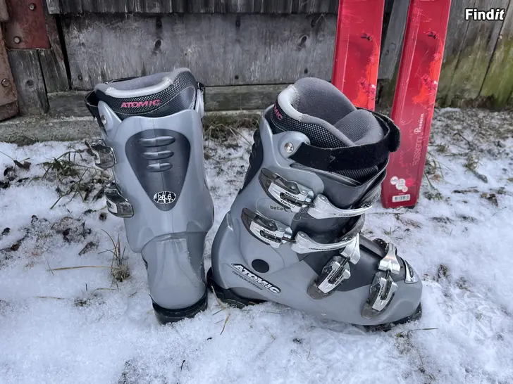 Slalomskidor och slalomskor säljes som paket. Skidorna är 146cm långa. Skorna storlek 26,5.