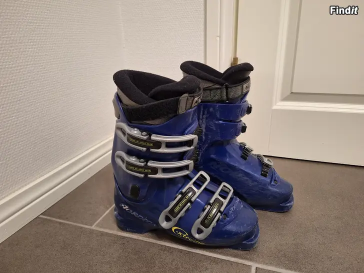 Nordica slalomskor, motsvarar ca storlek 35. På skorna står det 23,0-23,5 men motsvarar inte den storleken enligt mig.