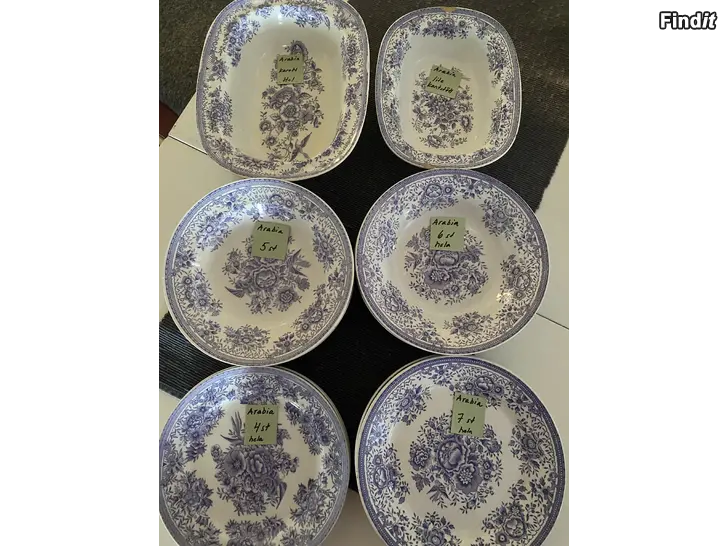 Hela arabias tallrikar. 2 karotter. Den mindre är lite kantstött. Tallrikarna 2€/st. Stora karotten 5€. Den mindre 2€