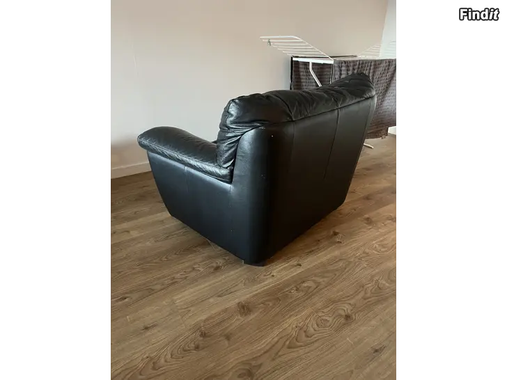 Säljer en bekväm och robust svart läder fåtölj i fint skick