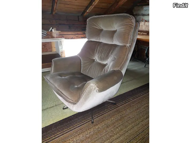 Till salu en väldigt bekväm och stilfull vintagefåtölj med hög rygg och mjukt formade armstöd. Fåtöljen har ett sammetsliknande tyg och klassiska dekorativa knappar som ger den en tidstypisk retrolook. Den stabila metallfoten gör stolen stadig och lätt att flytta. Skick: Bra, hel och välvårdad Färg: Ljusbrun / beige Stil: Retro / vintage Transport till Vasa 10€