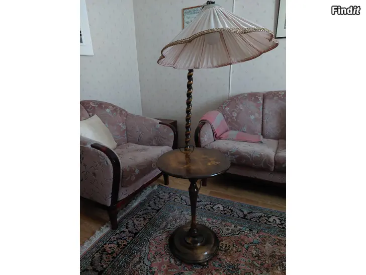 En unik och stilfull vintage‑lampa säljes. Lampan har en vackert svarvad träfot med dekorativ spiralformad stång samt en bred, plisserad lampskärm med dekorativ kant. Den inbyggda lilla bordsskivan passar perfekt för en bok, kaffekopp eller dekoration.