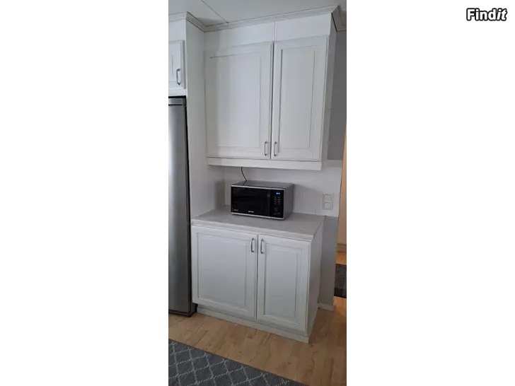 Hela köket säljes i första hand i sin helhet, utan vitvaror. Rostfri diskbänk med en traditionell Oras vattenkran medkommer, samt tillhörande bänk och täckskivor. Bänkskivorna är hela utan större skavanker.