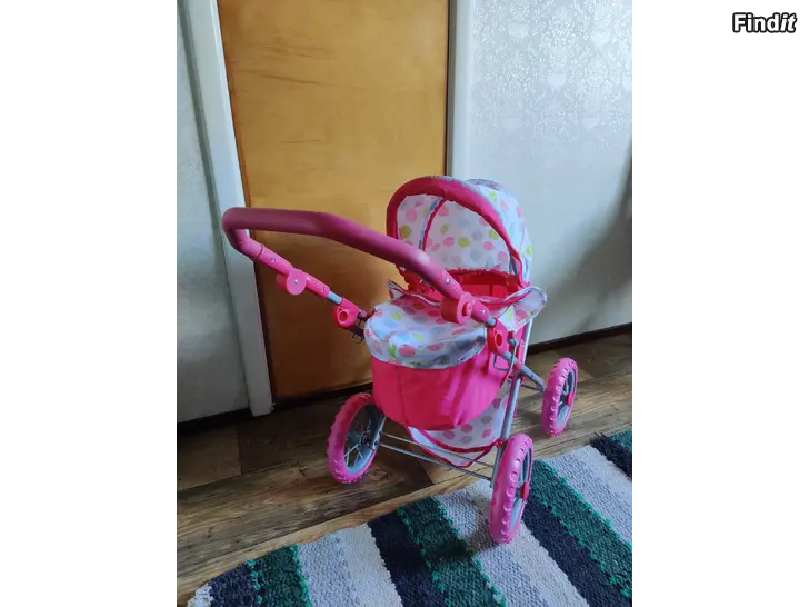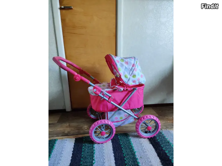 En rosa dockvagn säljes. I fint skick förutom att den är aningen sned pga att det suttit tunga passagerare, så som husets frass, i vagnen.