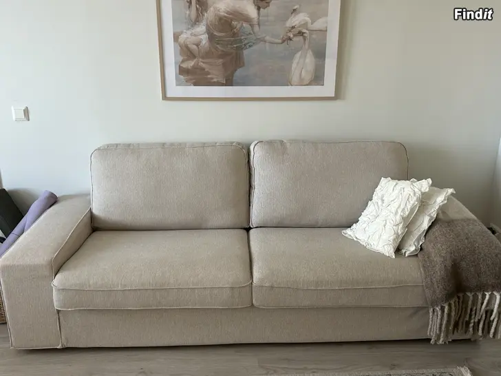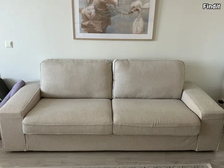 En tresitssoffa Kivik i ljus beige färg. Ryggkuddarna visar lite spår av användning i formen, men i övrigt är soffan i mycket gott skick och tyget är rent. Den har använts väldigt lite och blir nu överflödig för mig på grund av flytt. Inga husdjur i hemmet. Priset kan diskuteras Nypris 649 €. Bredd: 228 cm Djup: 95 cm Höjd: 83 cm