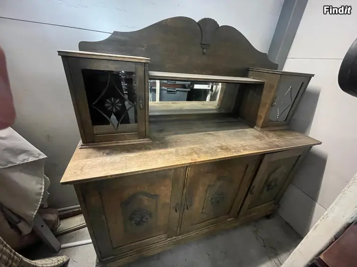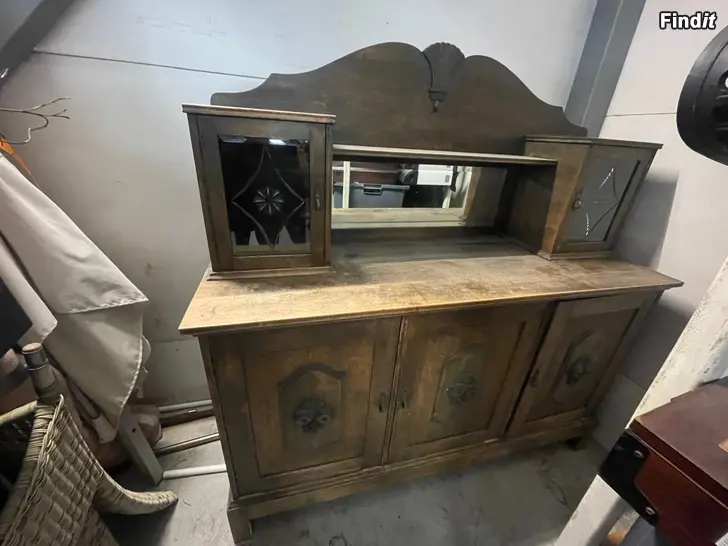 Kaunis isohko senkki 161x163, kolme isompaa ovea, jossa hyllyt sekä pieni ylälaatikko sekä tasolla kaksi pientä kaappia lasiovilla.