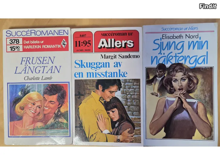 Önskar köpa följande titlar av Succéromanen / Allersromanen: nr 379 Tropisk kärlek av Violet Winspear nr 385 Högt spel av Anne Mather nr 397 Lyckan kommer av Rachel Lindsay nr 398 Minnen från igår av Carole Mortimer Flickan på hästen av Erik Nerle nr 8511 Älska mig innan jag dör av Bodil Forsberg. Fotot visar hur pärmarna kan se ut med andra titlar.